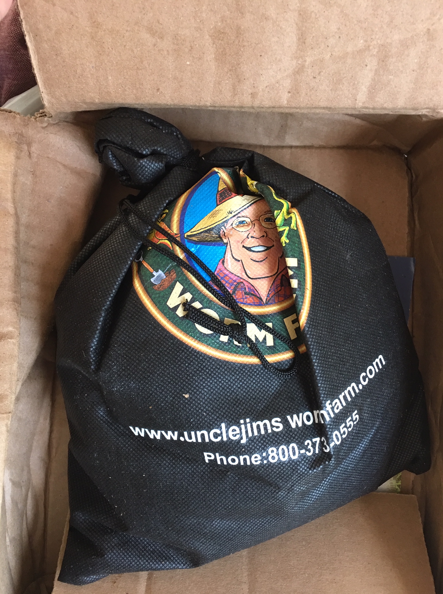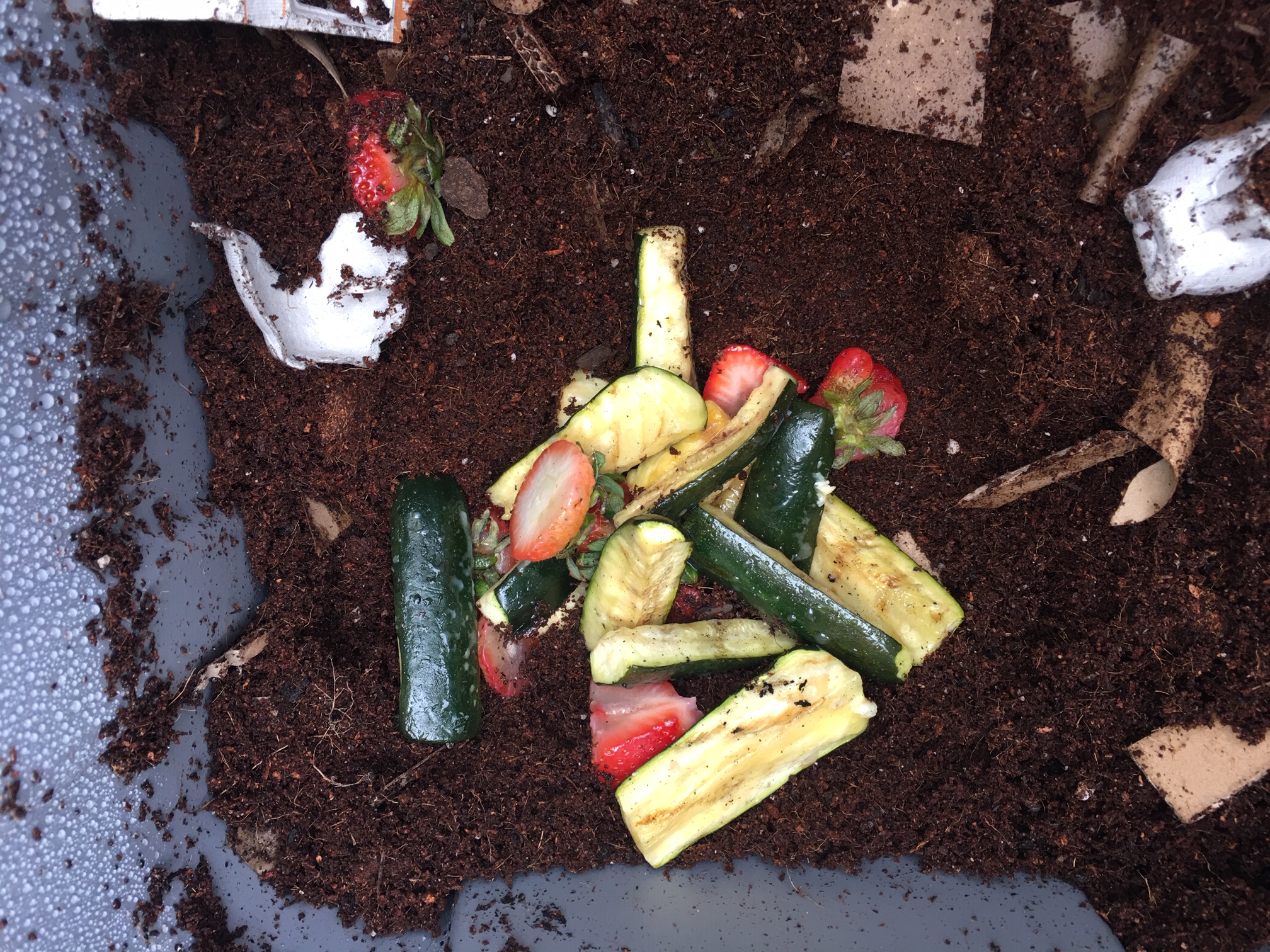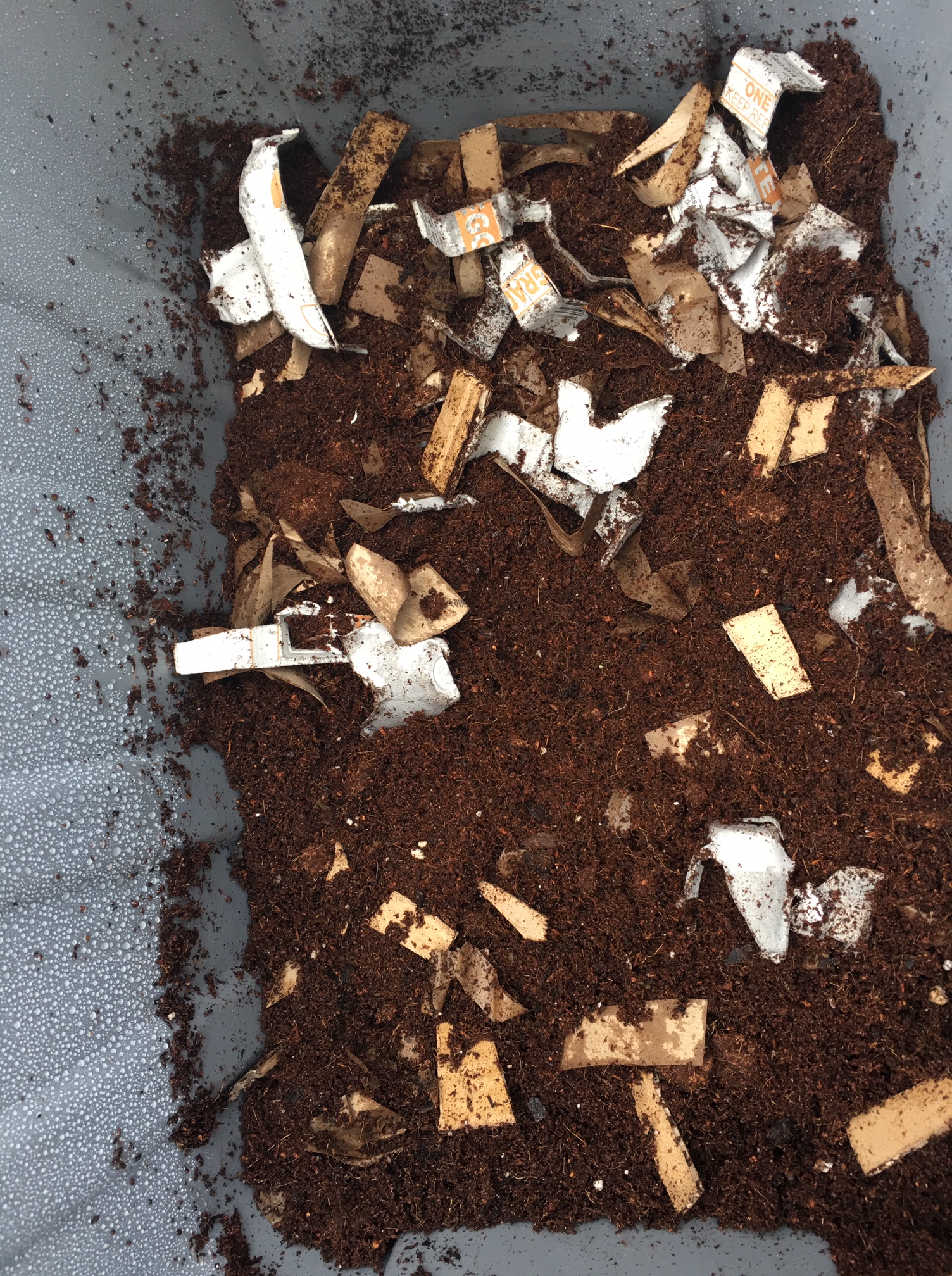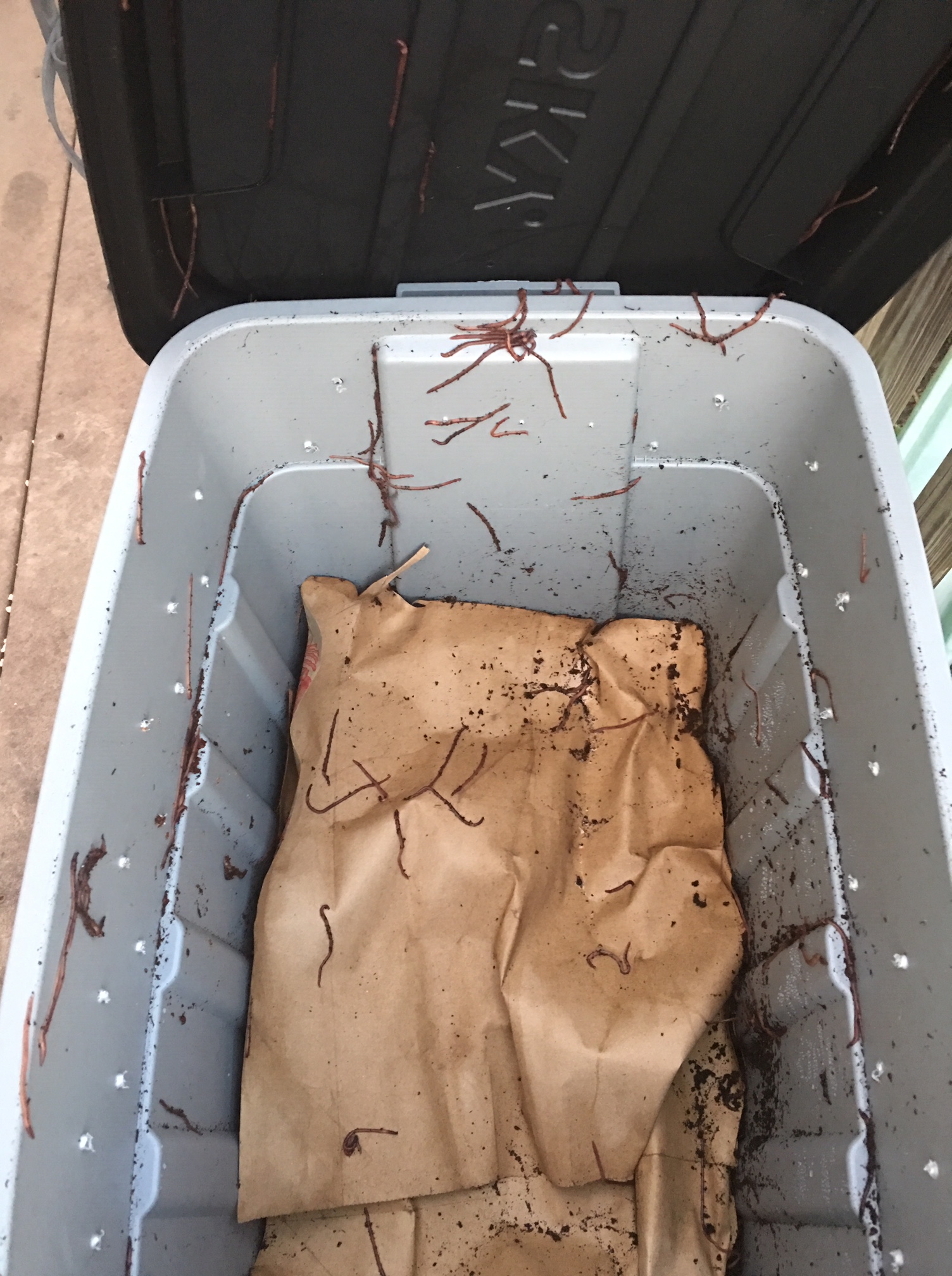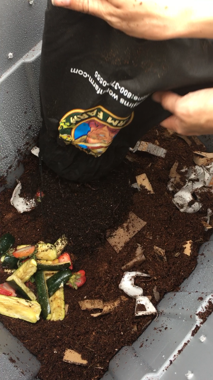 I found differing advice on whether or not to feed the worms right away, or to let them get settled for a day or two. I decided to go ahead and put some food in there, because they were in the mail for two days and I figured better safe than sorry. I dug a little spot for the food, and then poured them out of their bag. They definitely looked skinny, but were very wriggly which was great. I read another tip to cover them with damp newspaper to stop them from sneaking out of their bedding and up the sides of the bin in a bid for freedom. I didn’t have newspaper but I did have some paper grocery bags from Trader Joe’s, and I figured that would work. Once they were all tucked in I closed up the bin and let them rest.