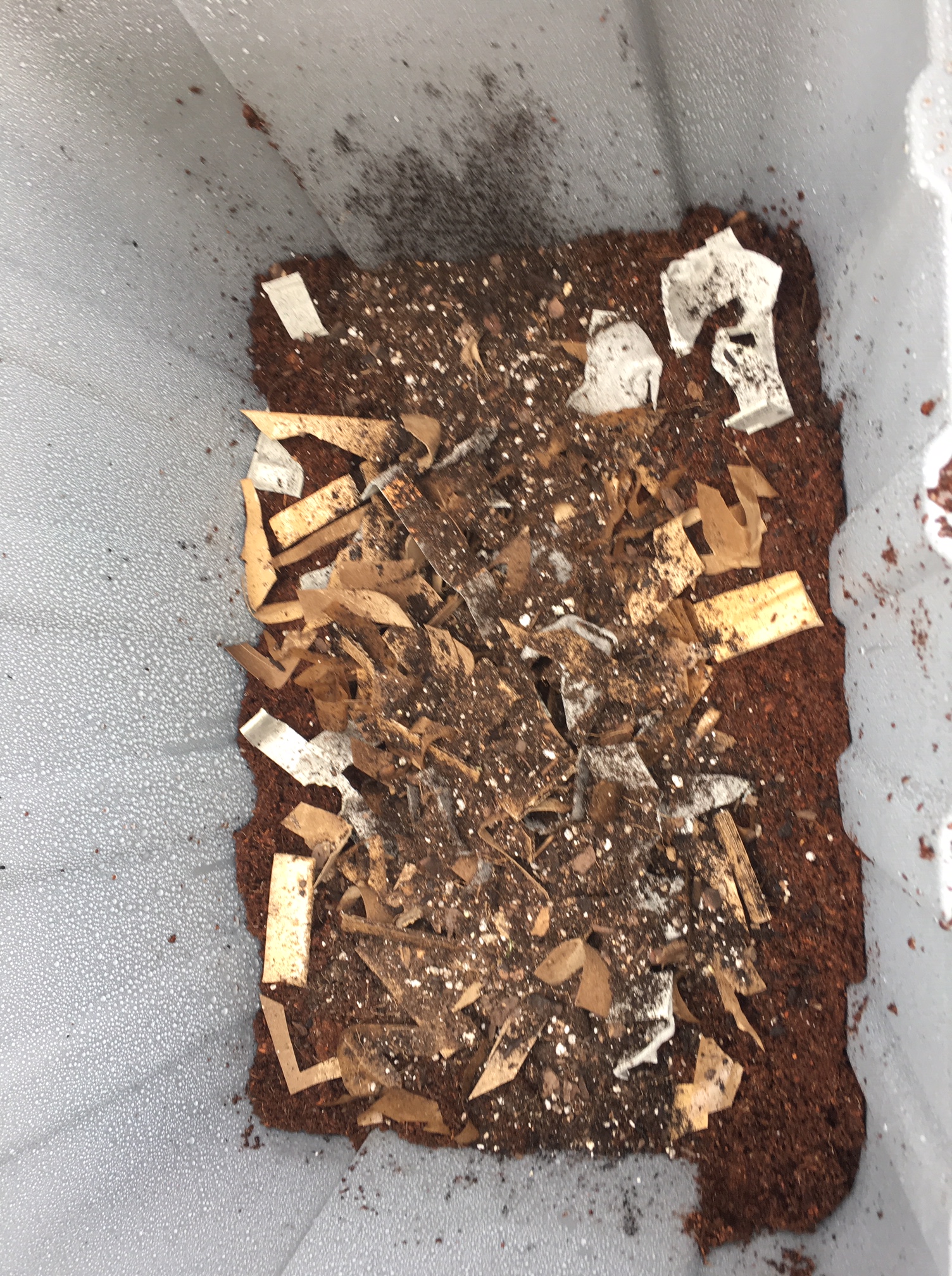 So this morning after it had warmed back up a bit, I removed the paper and scooped everyone back into the bedding. Another fact I had read was that they hate light, so after I put the worms back into the bottom of the bin, I left the lid off for a few minutes with the hopes that they would burrow back in and away from the sunlight. While waiting for them to do that, I removed the paper and sprayed it with water to make sure it was still damp enough and then I tucked them back in. When I was putting the paper back in, it did seem like most of them had burrowed into the bedding, so I think my sunlight trick worked. I haven’t checked on them again since then, but hopefully they stay in there this time! I’ll peak in on them later, but keep your fingers crossed for me!