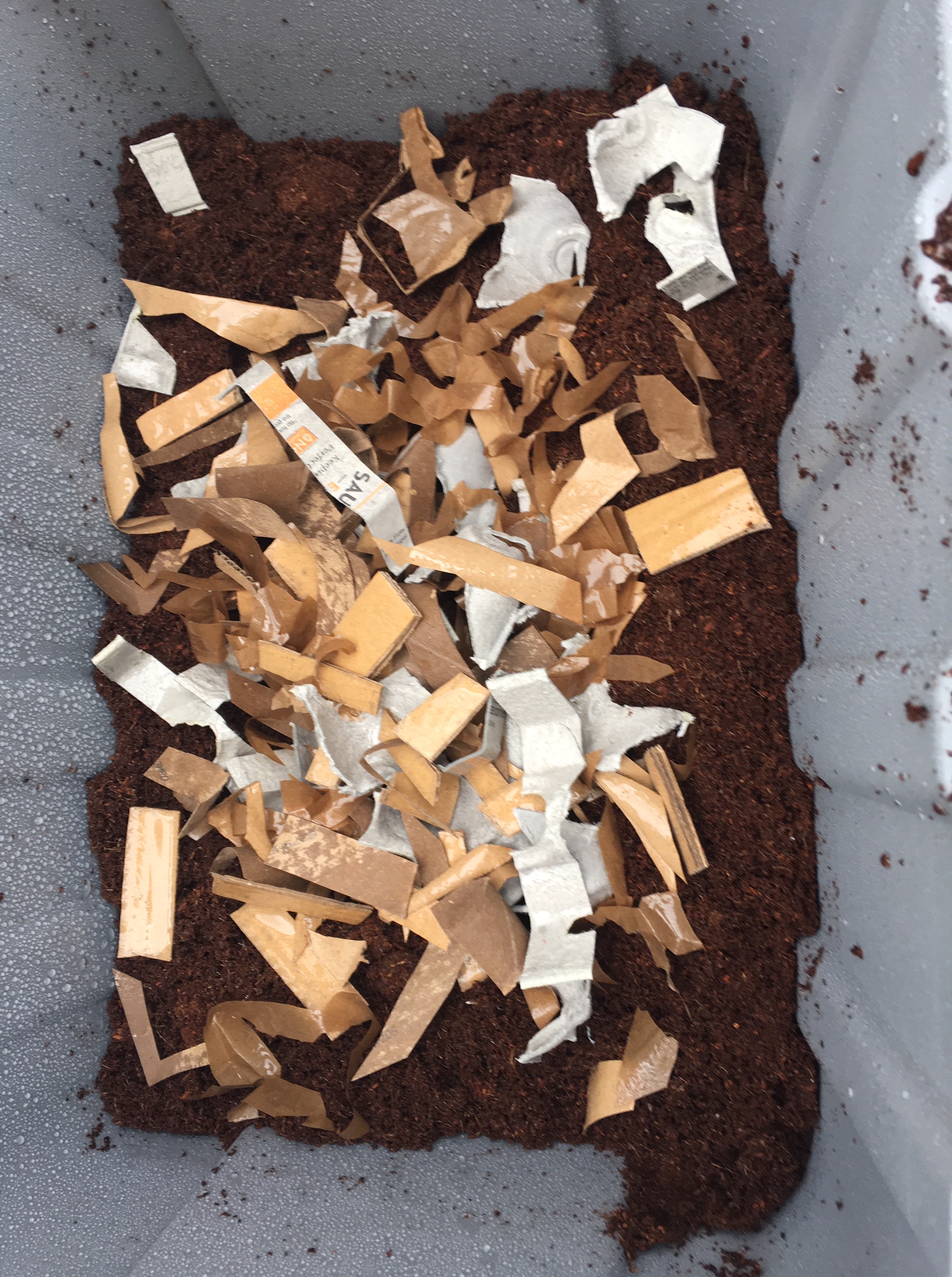 I opted for a smaller-sized bin, because I need to be able to transport it between home and the big garden. I figure I won’t leave it there during the winter, and therefore I need to be able to fit this thing in my car. After placing my worm order, I started gathering the rest of the materials for worm bedding (I won a free block of coco coir from the website where I ordered the worms, so that was very exciting and helpful). I pulled a lot of cardboard and brown paper scraps out of the recycling and cut them up to mix with the bedding. Then I waited impatiently for two days.