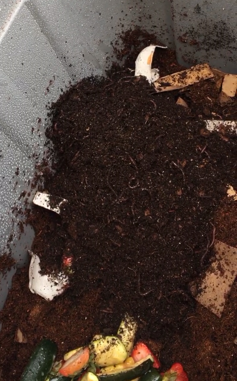 All worm-escape-shenanigans aside, I’m very excited to have this bin going now! While the ultimate goal is to move the bin to my community garden plot, I’m going to start by keeping the bin on my deck for a few weeks until the weather is consistently warmer, and until I know they’re well established and I have a good idea of how often they need to be fed. For their first feed I gave them some kitchen scraps, and once I see they’re actually eating and reproducing I’ll introduce other yard waste so they aren’t so jarred when they get to the big garden and their diet will change somewhat. I’m feeling optimistic!