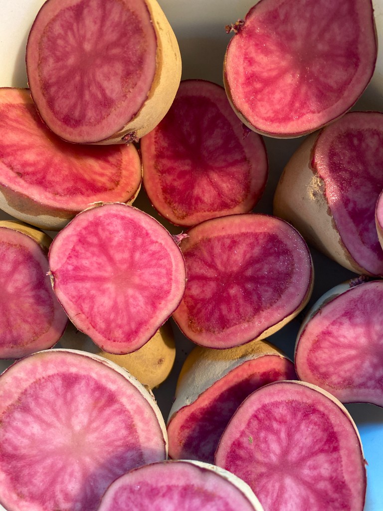 They arrived from Fedco Seeds at just the right time, because I was very much in need of a smile that day. I had to wait a few days to prep and plant them, but they were very much worth it. Cutting into the Adirondack Reds the day before planting was a surprise I was not expecting. My seven year old had no idea that potatoes could be so cool.