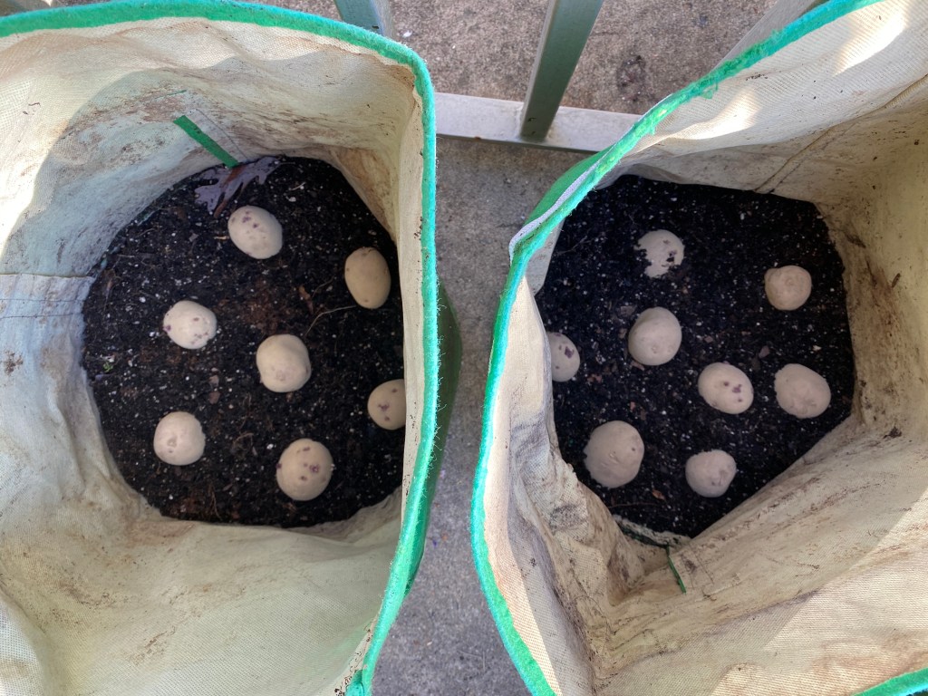 I didn’t chit them, because it’s warm here already (Zone 7a here!) and the potatoes already have little sprouts going. I just cut the big ones in half and let them sit for about 24 hours and dug the old grow bags out of the garage while I waited.
